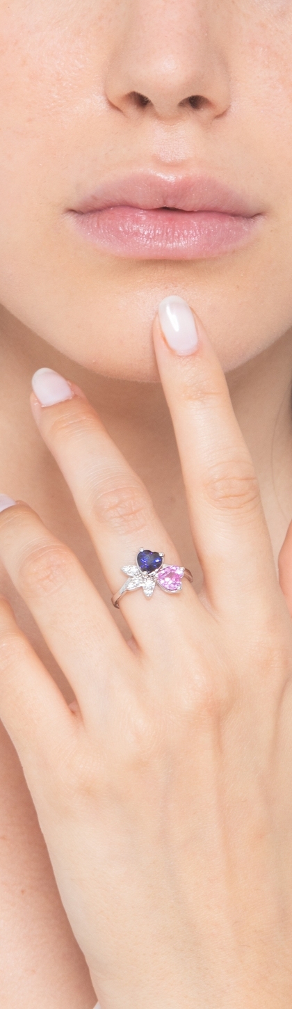 Bague en or blanc 18K avec saphirs bleus et roses en taille cœur et diamants taille brillant, couleur H, pureté VS.