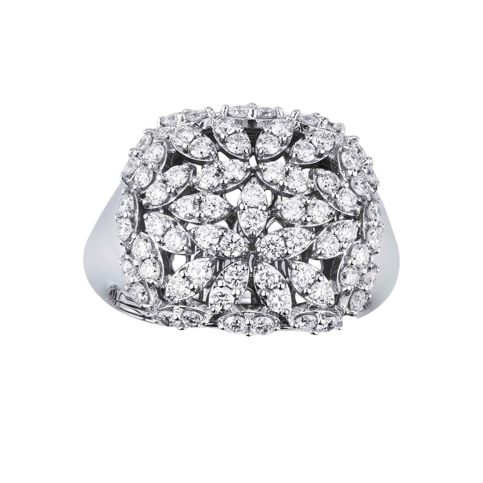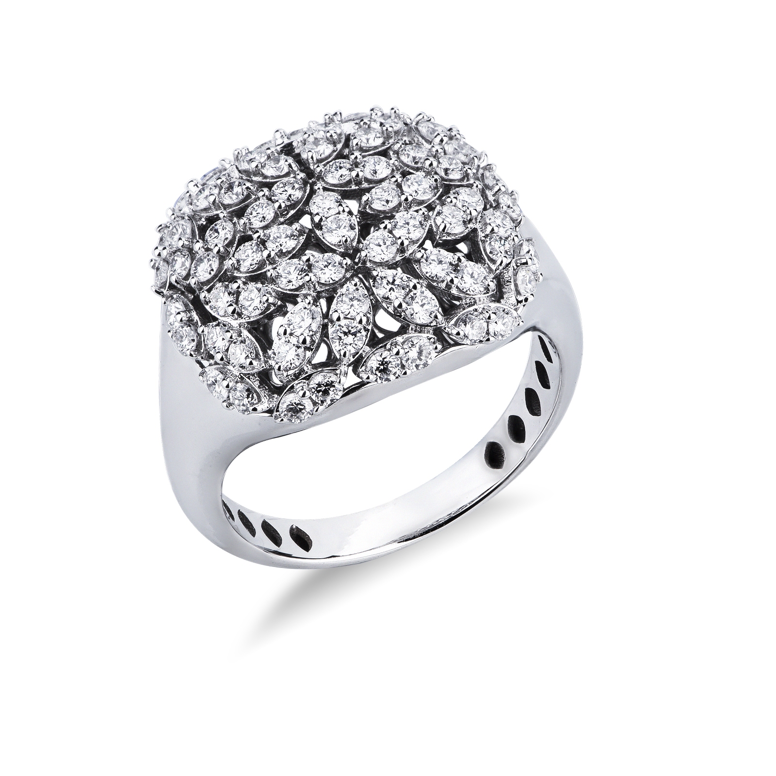 Bague en or blanc 18 carats sertie de diamants taille brillant, couleur H et pureté VS, formant un élégant motif de fausses navettes. Un bijou raffiné et moderne qui allie créativité et éclat intemporel, idéal pour toutes les occasions spéciales.