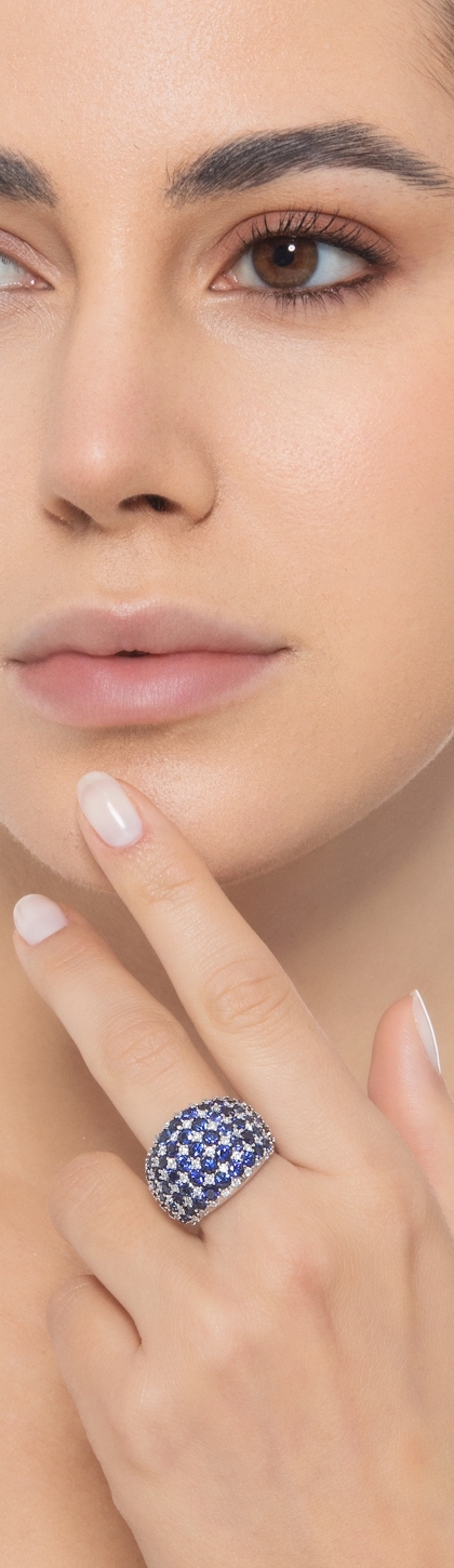Bague design en or blanc 18k avec cinq rangées de saphirs bleus et six rangées de diamants taille brillant, couleur H, pureté VS.