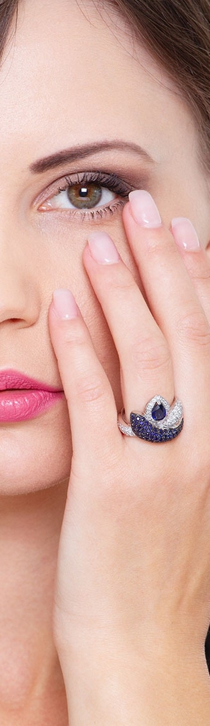 Bague serpent en or blanc 18K sertie de diamants taille brillant de couleur H et pureté VS, ainsi que de saphirs bleus taille brillant. Sur la tête du serpent est serti un saphir bleu en forme de goutte