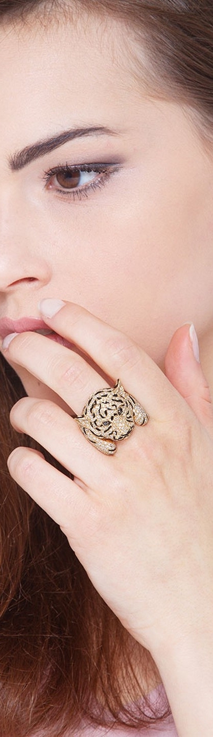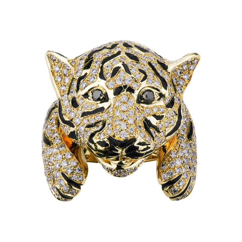 Bague Tigre en Or Jaune 18k avec Diamants et Émail Noir
