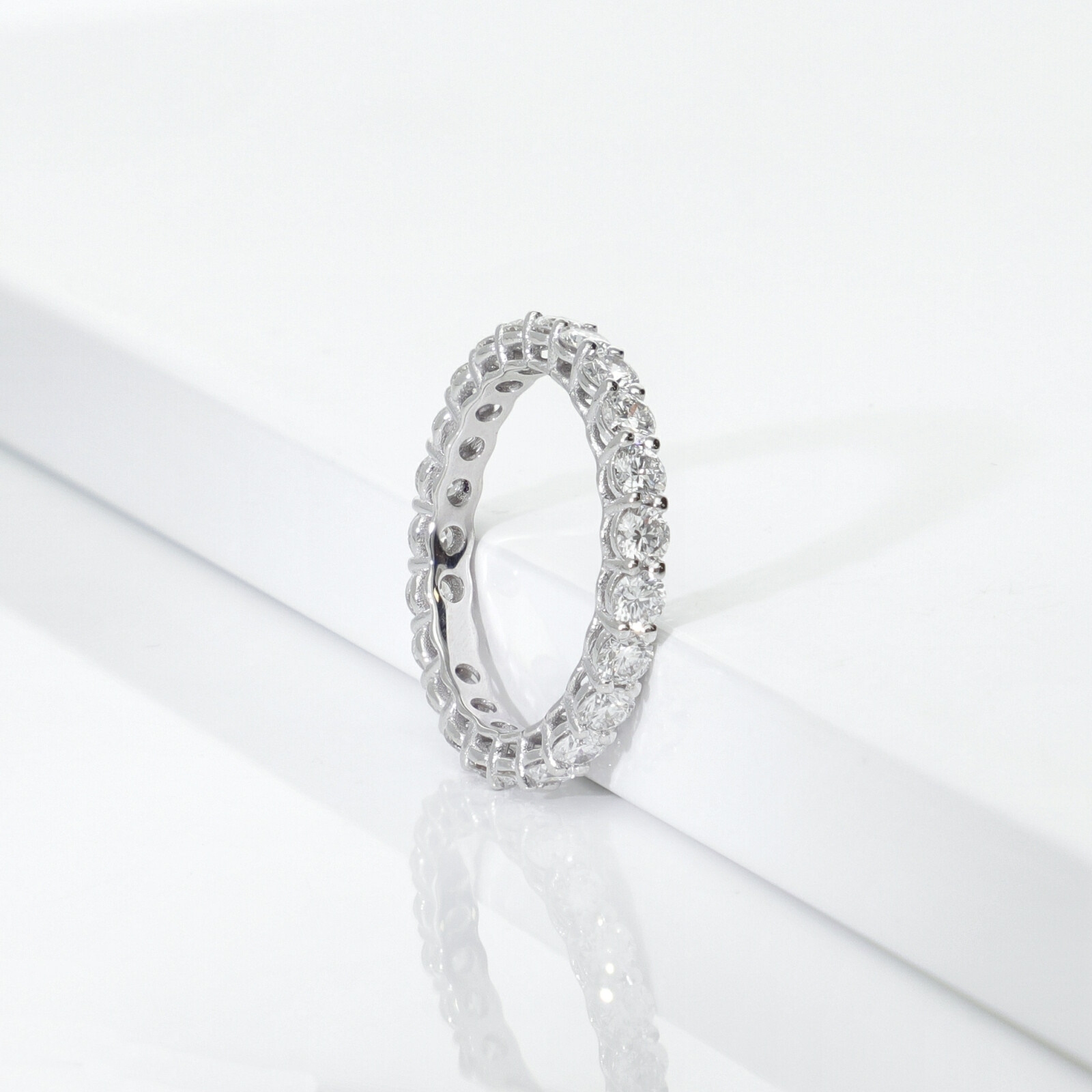 Bague eternity en or blanc 18k avec diamants taille brillant couleur H pureté VS, environ 0,08 ct par pierre. Un design élégant et lumineux parfait pour un usage quotidien ou comme alliance.