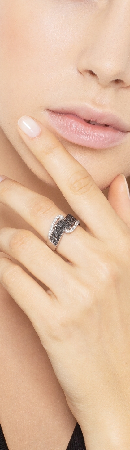 Bague en or blanc 18 carats avec pavé de diamants noirs et double rangée de diamants blancs