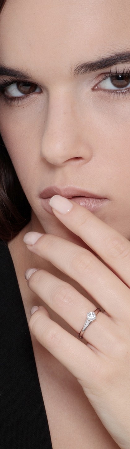 Solitaire, or blanc 18 carats, avec une tige linéaire, couleur H, pureté VS, taille brillant.