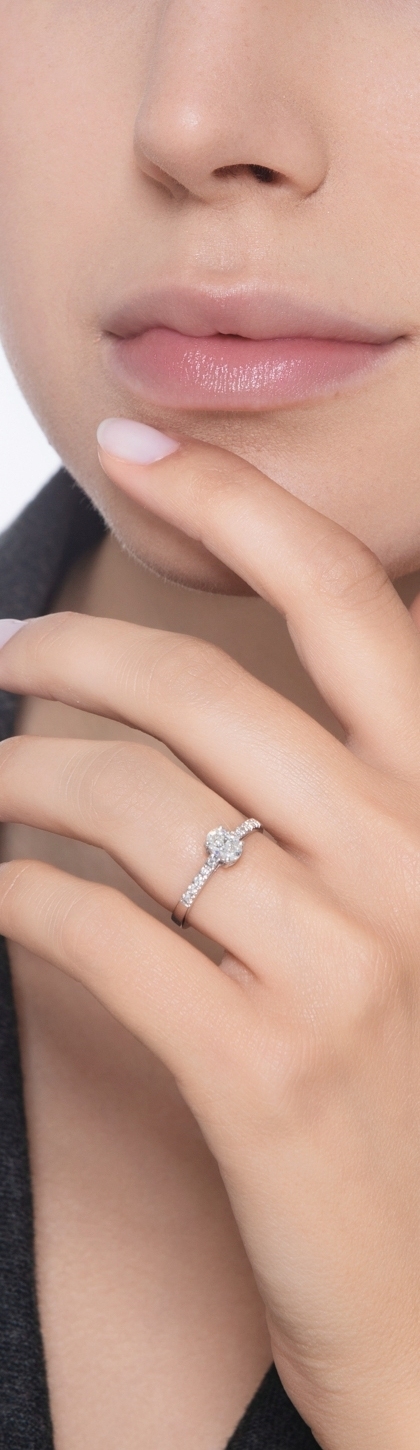 Un éclat rare pour une émotion unique. Cette bague solitaire en or blanc 18k est ornée d’un diamant central naturel taille ovale, certifié GIA, couleur F, pureté VS, sublimé par des diamants latéraux naturels taille brillant couleur H, pureté VS. Une création lumineuse, symbole d’un amour pur et raffiné, pensée pour marquer les moments les plus précieux avec élégance.