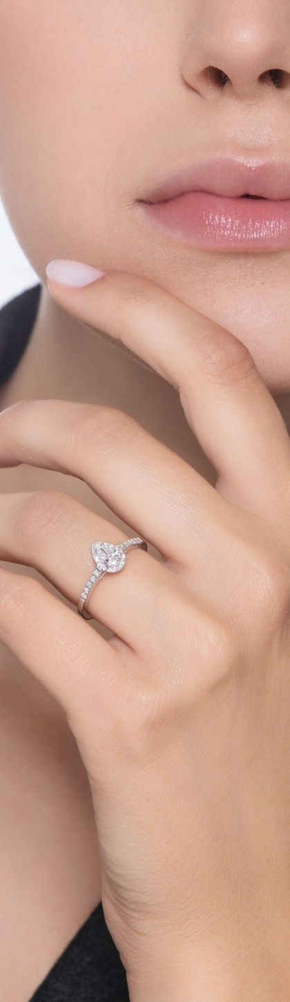 Un symbole d’amour éternel. Cette bague solitaire en or blanc 18k présente un diamant central naturel taille poire, certifié GIA couleur F, pureté VS, sublimé par des diamants naturels latéraux taille brillant couleur H, pureté VS. Une pièce d’exception au raffinement absolu pour une déclaration inoubliable.