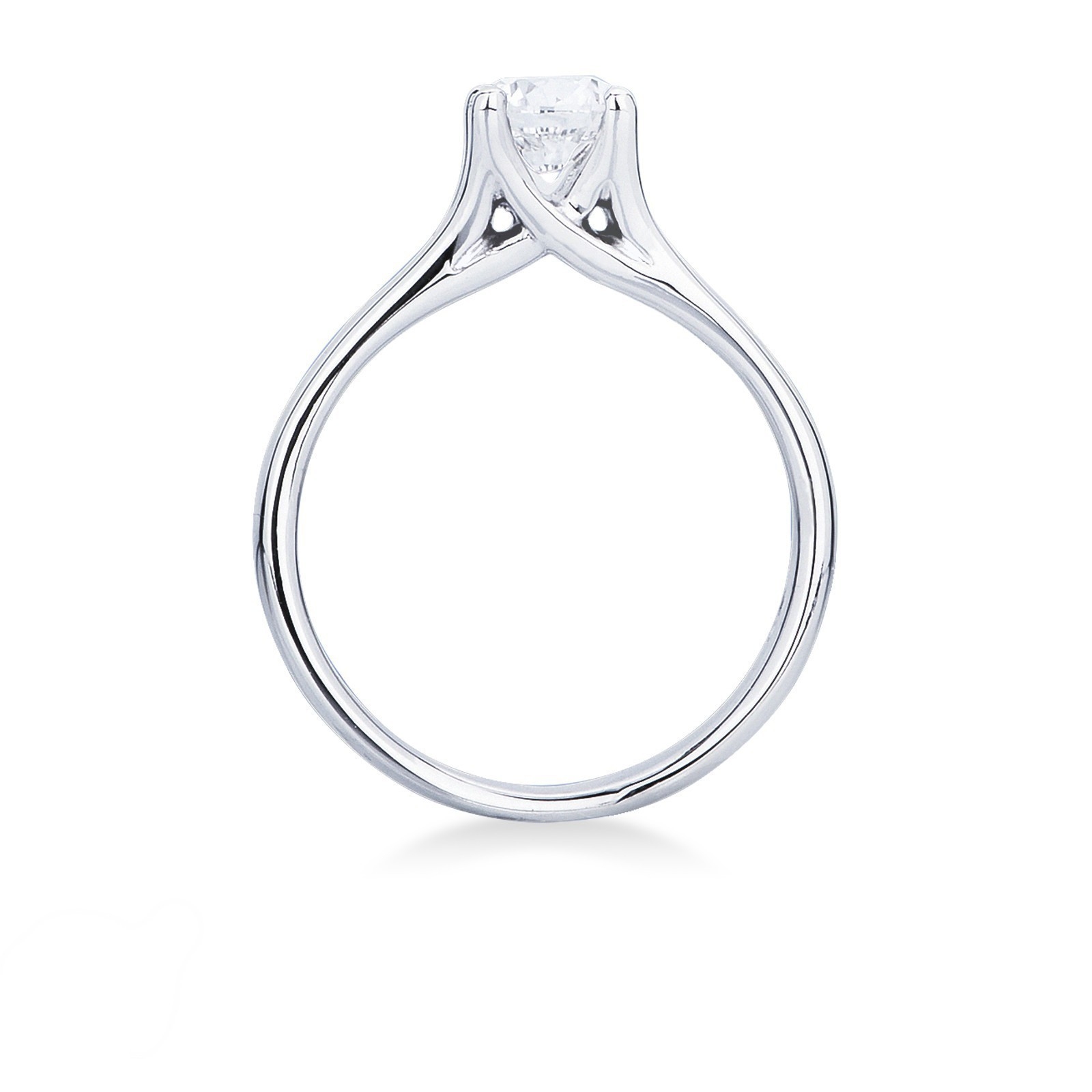 Bague solitaire au design linéaire et raffiné, avec quatre griffes qui maintiennent un diamant taille brillant de 0,70 ct, couleur H et pureté VS. Élégance intemporelle en or blanc 18 carats, parfaite comme bague de fiançailles, bague en diamant ou cadeau précieux. Sa monture épurée met en valeur la brillance et la pureté maximales du diamant, offrant sophistication et luxe à chaque détail.