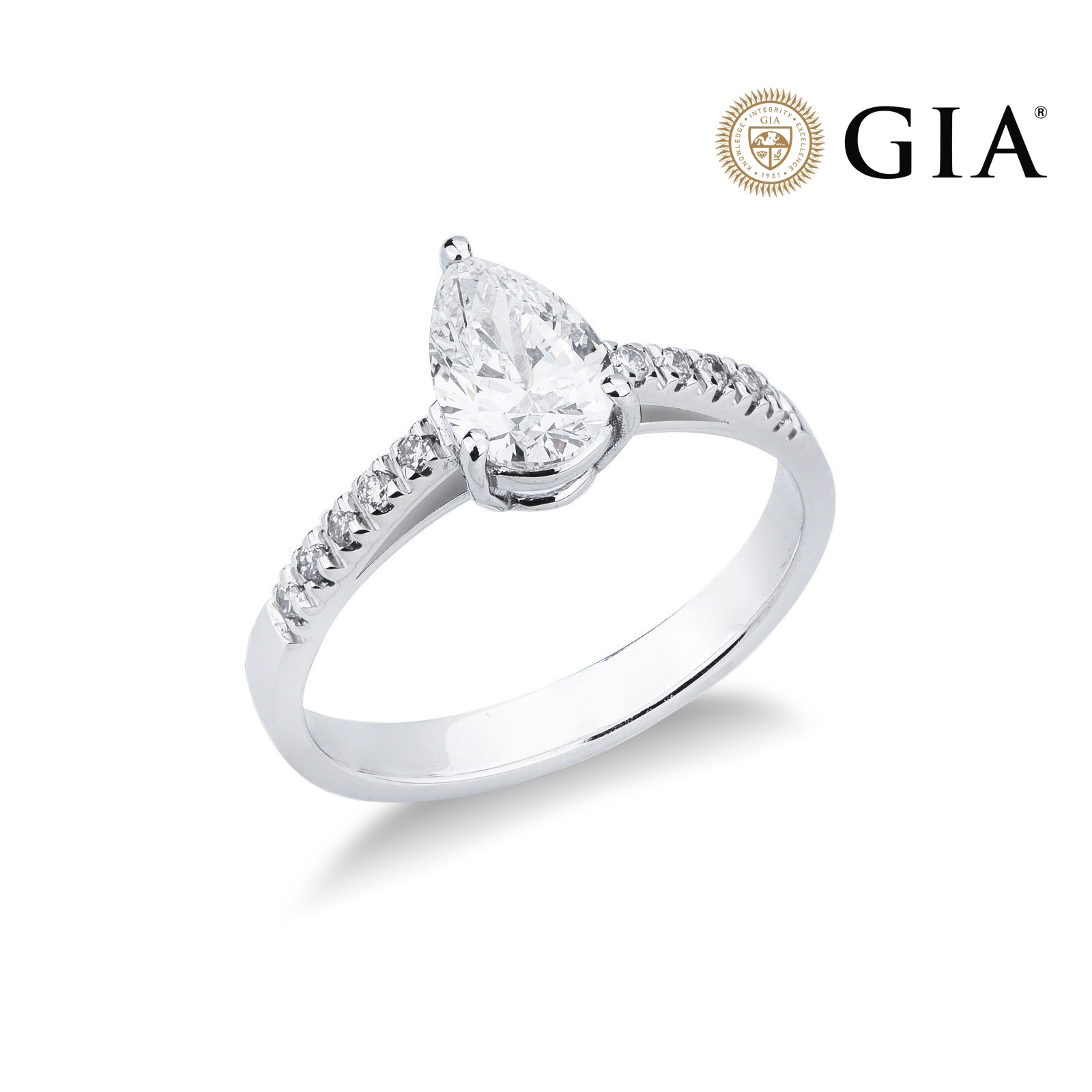 Bague solitaire en or blanc 18k avec diamant poire certifié GIA et diamants latéraux
