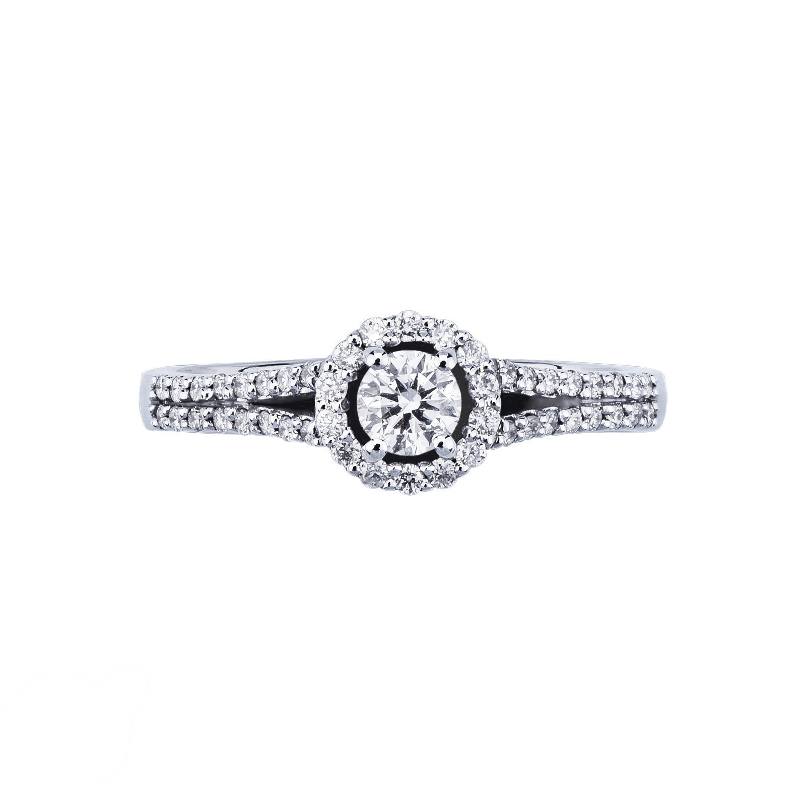 Bague modèle solitaire raffinée en or blanc 18 carats, avec des diamants taille brillant de couleur H et pureté VS également sur le jonc, et un diamant central de 0,25 ct. Élégance intemporelle et sophistiquée, parfaite comme bague de fiançailles, cadeau précieux ou bijou pour occasions spéciales. Le design met en valeur la brillance et la pureté maximales des diamants, offrant luxe et raffinement dans chaque détail.