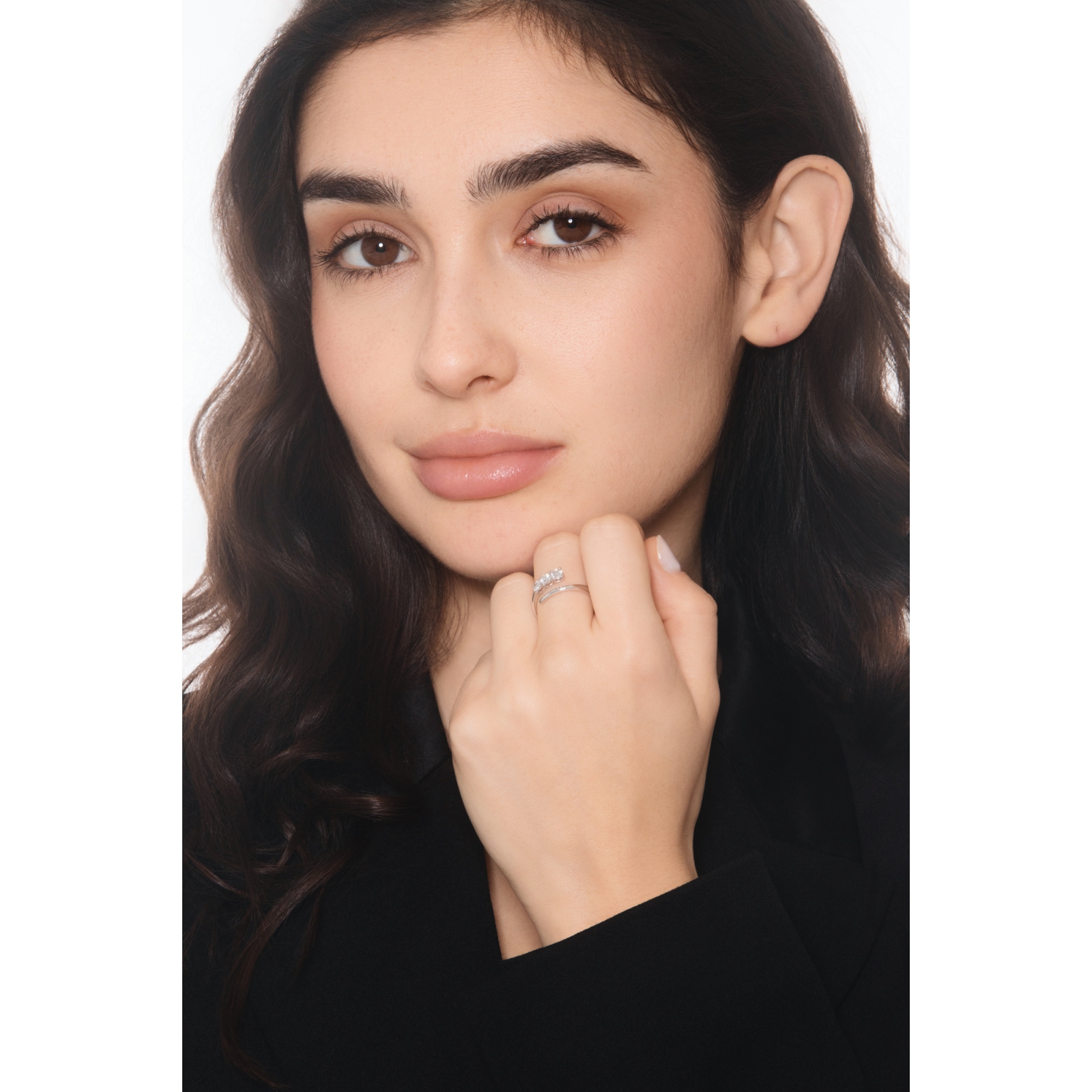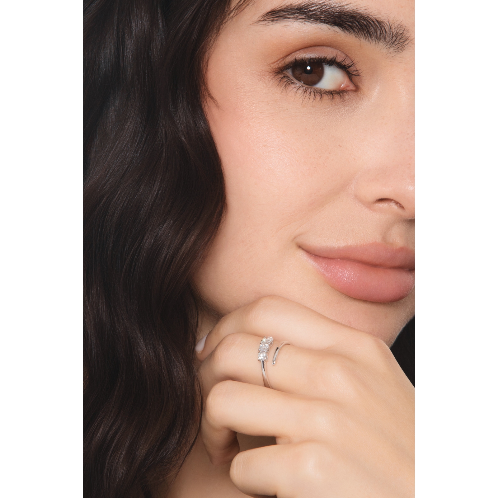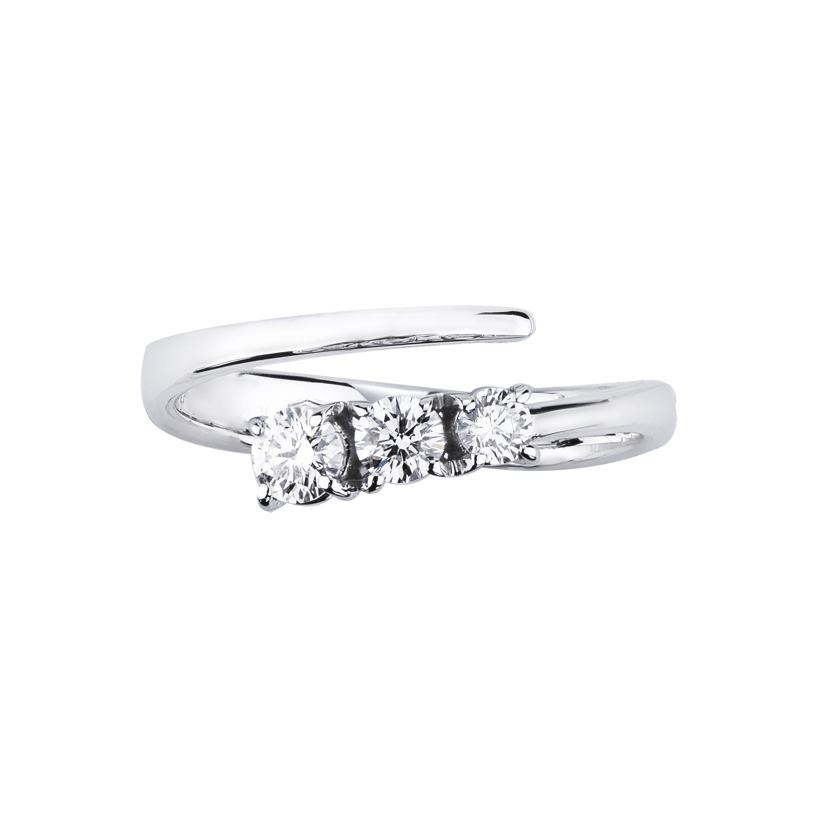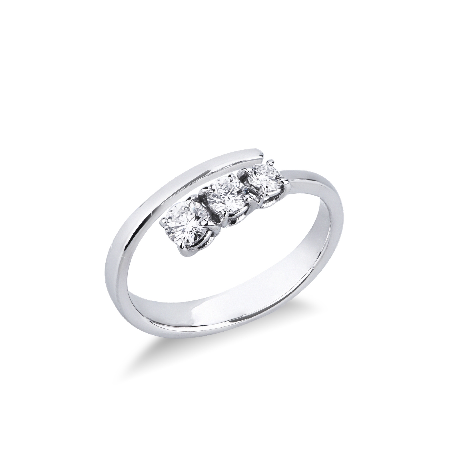 Bague trilogy contrarié en or blanc 18 carats ornée de trois diamants taille brillant, déclinés en taille croissante. Les diamants présentent une couleur H et une pureté VS, offrant un éclat raffiné et intemporel.