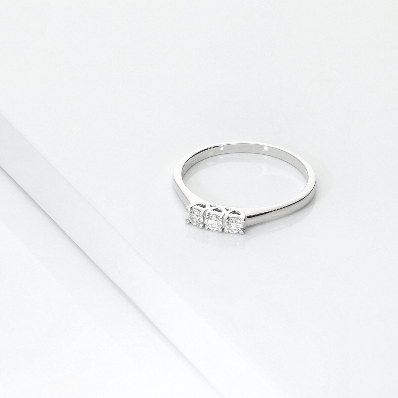 Bague pour femme en or blanc 18 carats, de style trilogy linéaire, sertie de diamants taille brillant, de couleur H et pureté VS. Un design élégant et intemporel, idéal comme bijou de luxe pour usage quotidien ou cadeau raffiné.