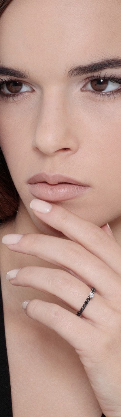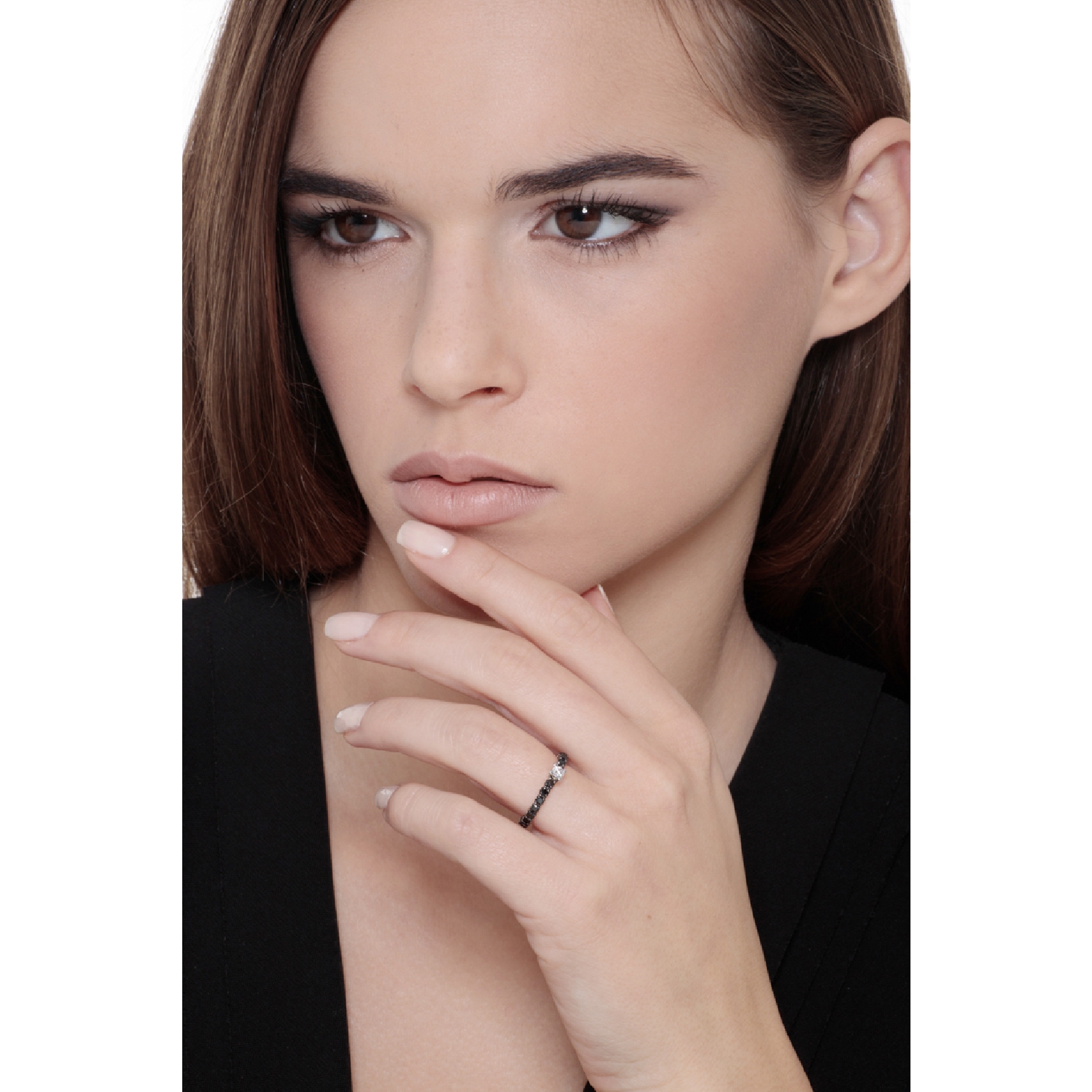Bague alliance en Or Blanc 18k avec diamant central et diamants noirs latéraux qui apportent contraste et élégance. Un bijou sophistiqué et polyvalent, idéal pour un usage quotidien ou pour des occasions spéciales