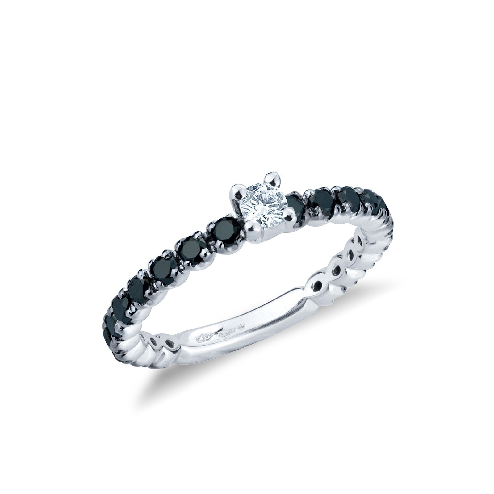 Bague alliance en Or Blanc 18k avec diamant central et diamants noirs latéraux