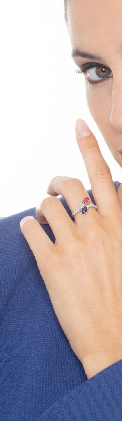 Bague contrarié en or blanc 18k avec un saphir bleu et un rubis