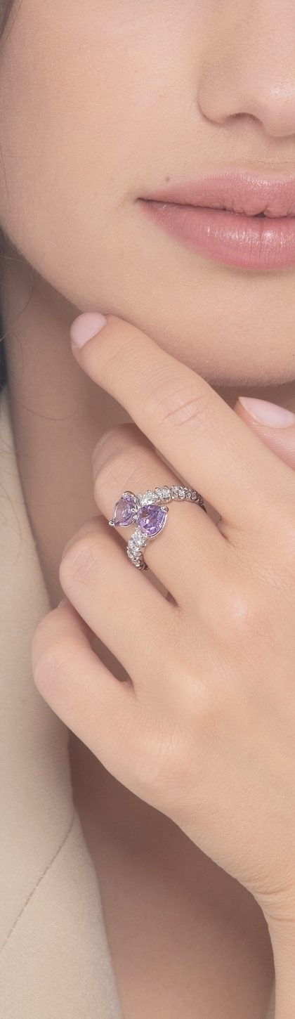 Bague Toi et Moi en or blanc 18k avec diamants et 2 améthystes en forme de cœur