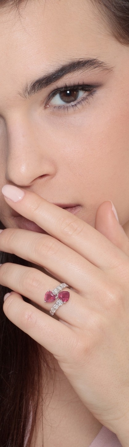 Bague Toi et Moi en or blanc 18k et 2 rubis en forme de cœur