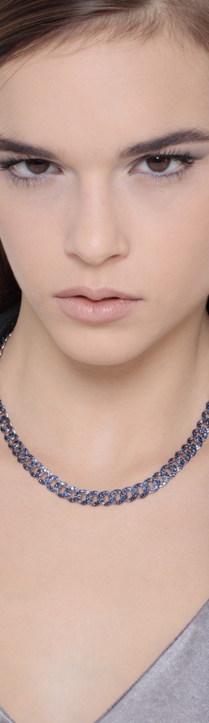 Collier souple à mailles gourmette en or blanc 18 carats, composé de 66 maillons de 7 mm sertis de saphirs bleus taille brillant sur des mailles brunies. Une création précieuse au design moderne où l’éclat du métal se marie à la profondeur du bleu, pour un bijou à la fois audacieux et raffiné.