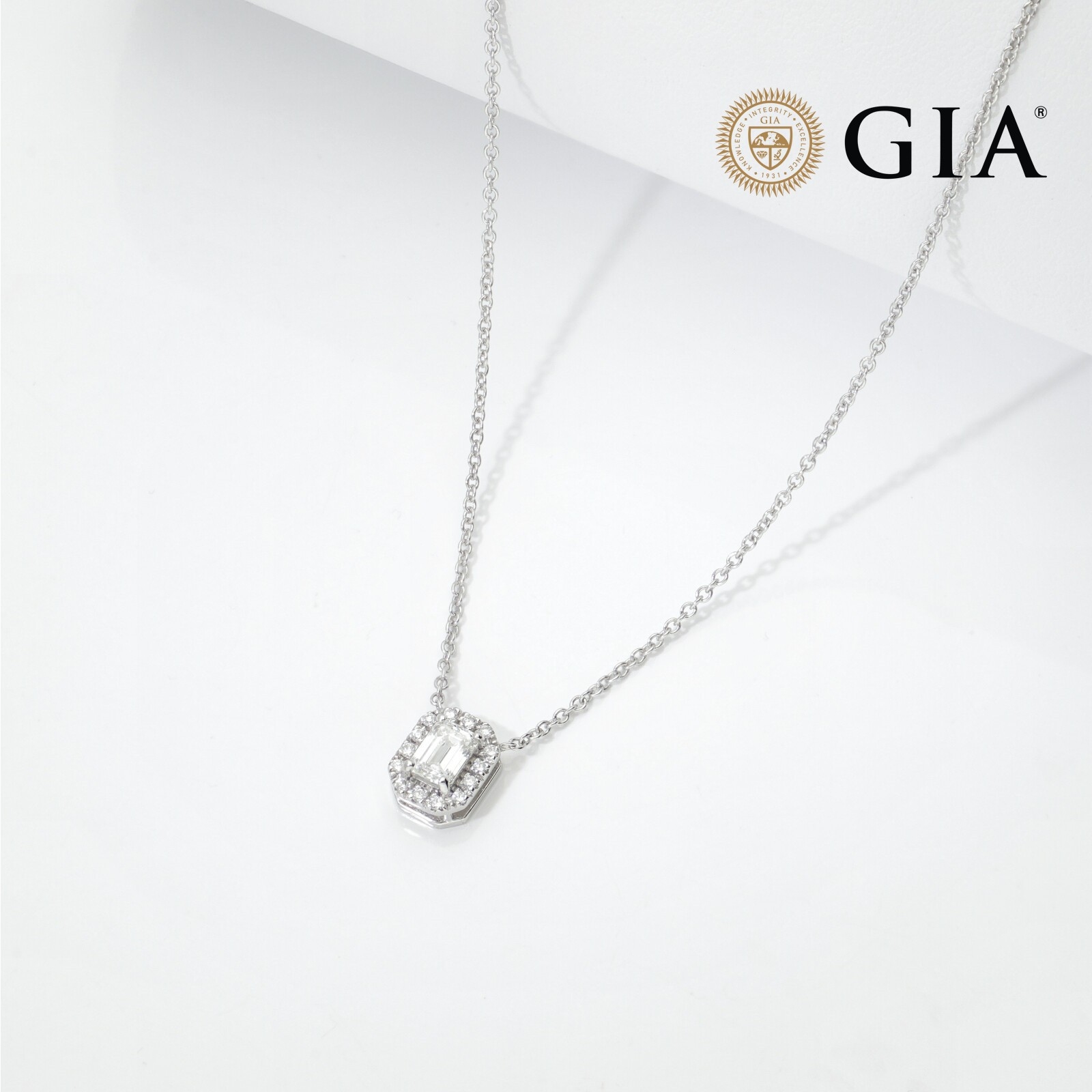 Collier Or Blanc 18k avec diamant émeraude GIA 0.50 CT et halo de diamants