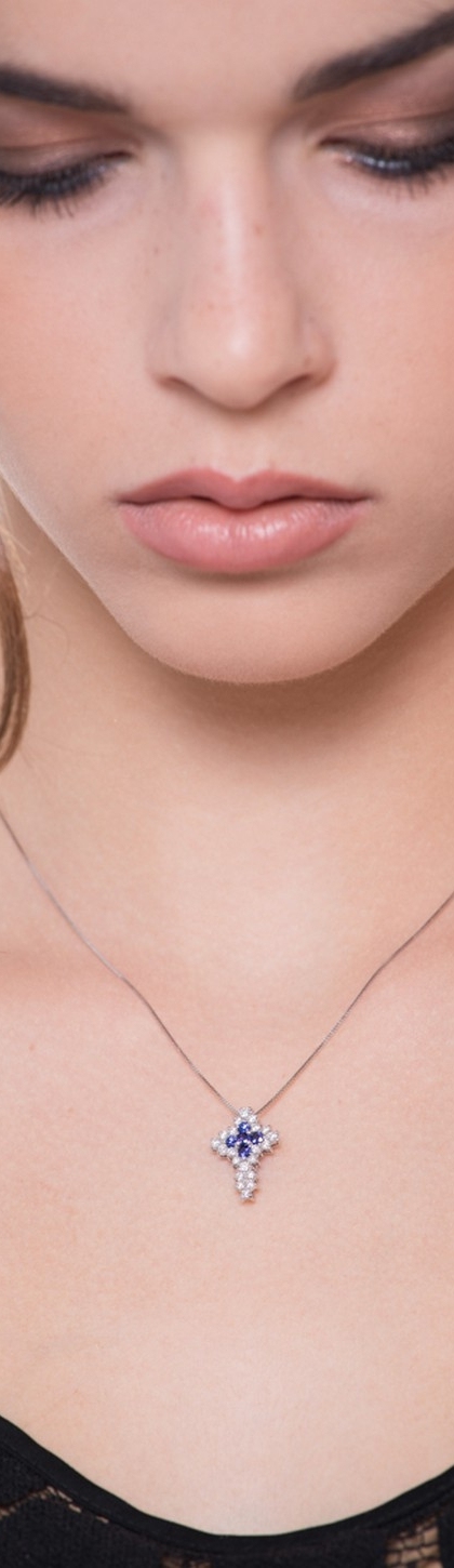 Collier avec croix en or blanc 18k avec saphirs bleus et diamants