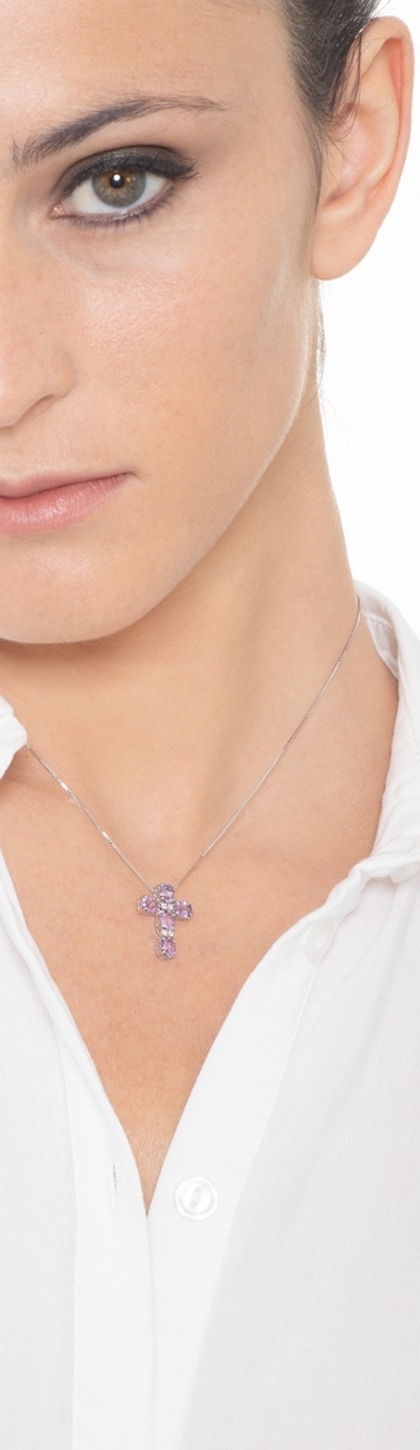 Collier en or blanc 18 carats avec croix d'améthystes et diamants