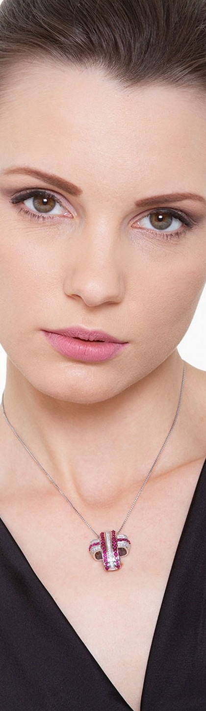 Collier en or blanc 18k avec croix bombée en diamants et rubis