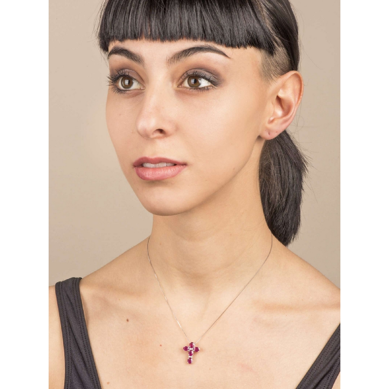 Collier en or blanc 18k avec pendentif croix serti de rubis et diamants