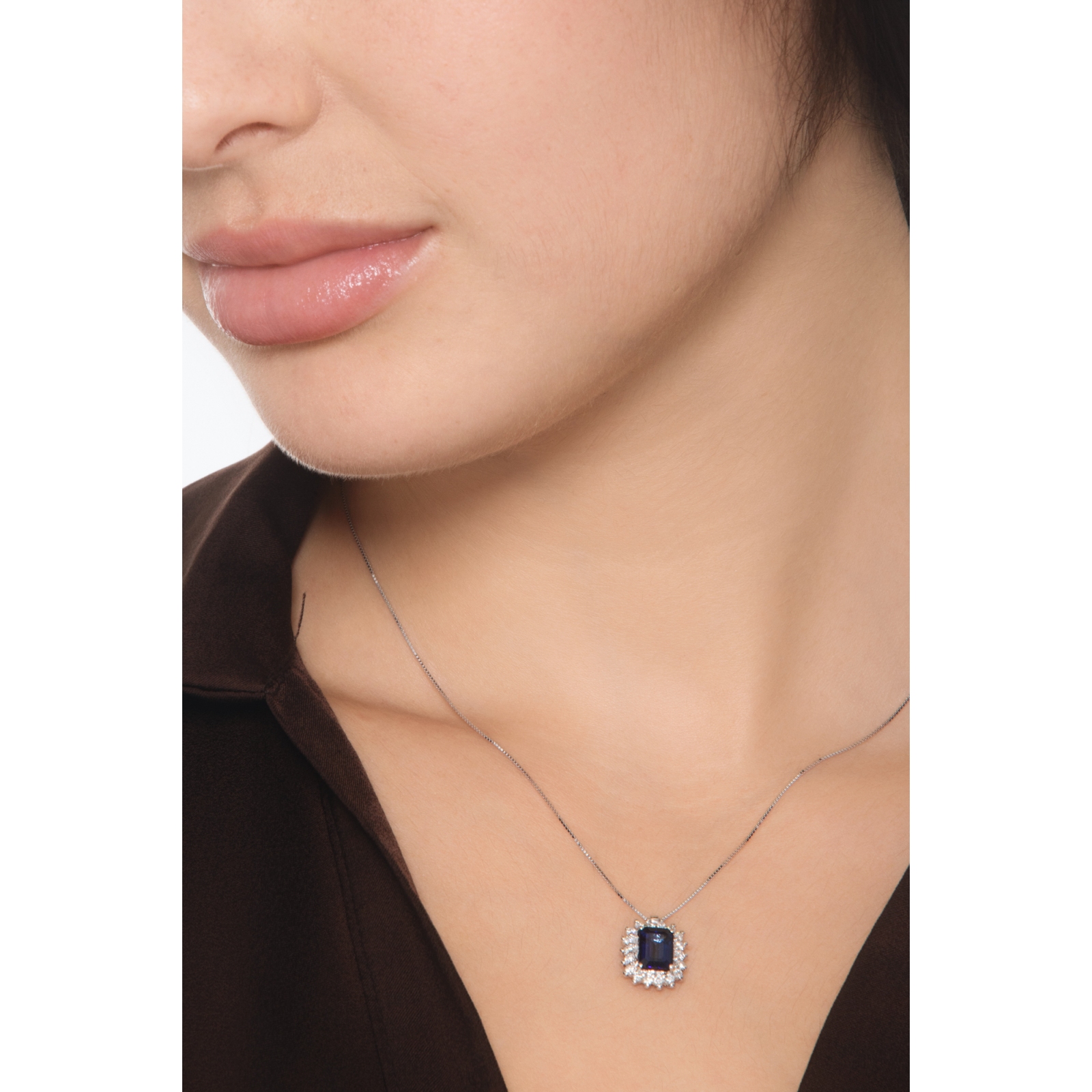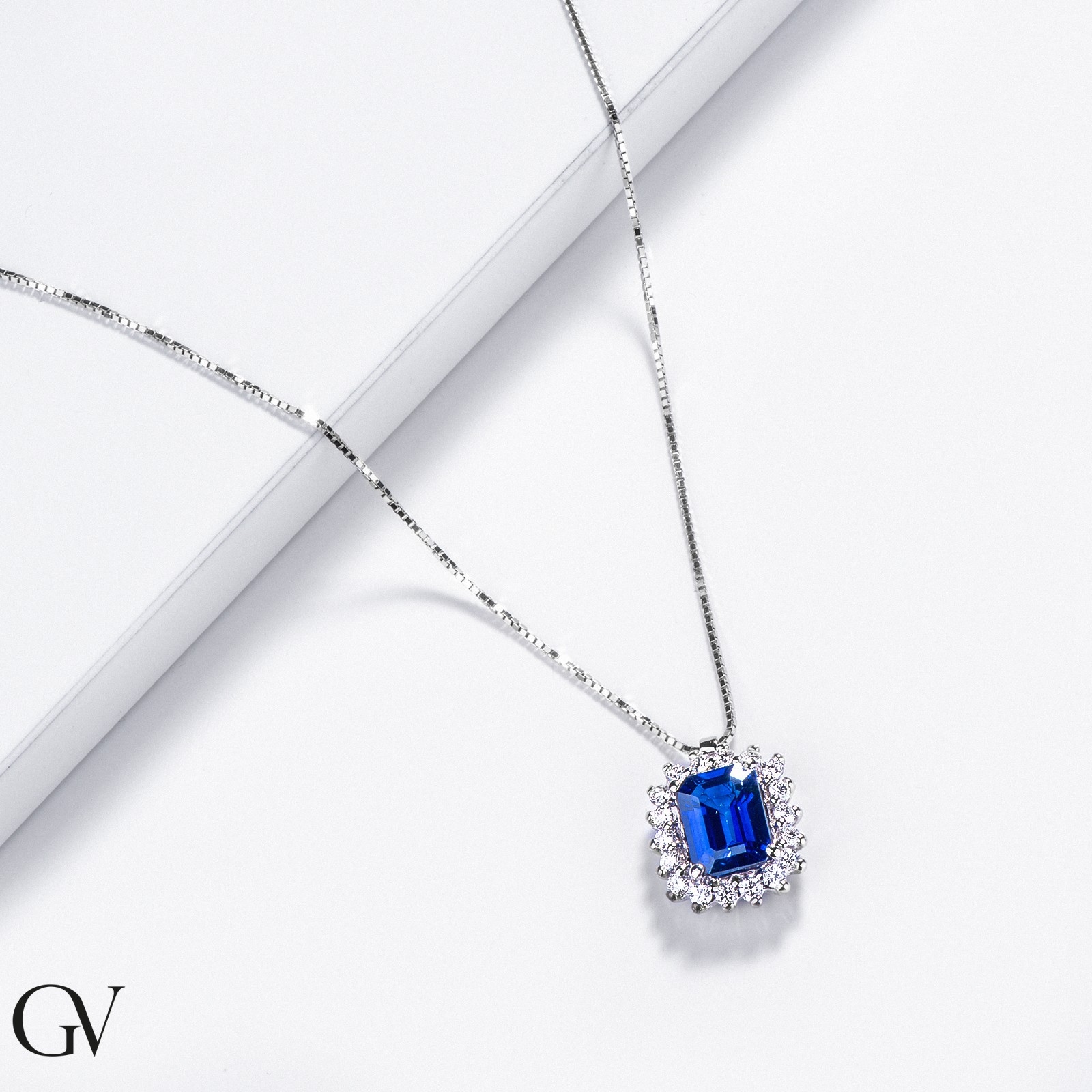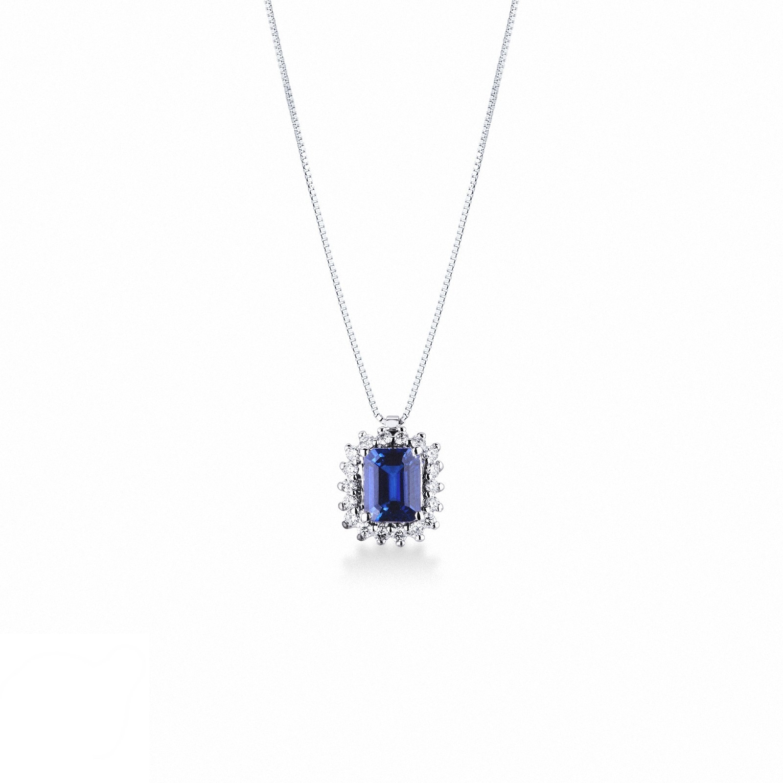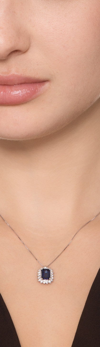 Chaîne en or blanc 18k avec pendentif saphir bleu et diamants