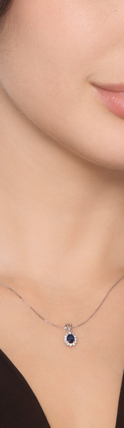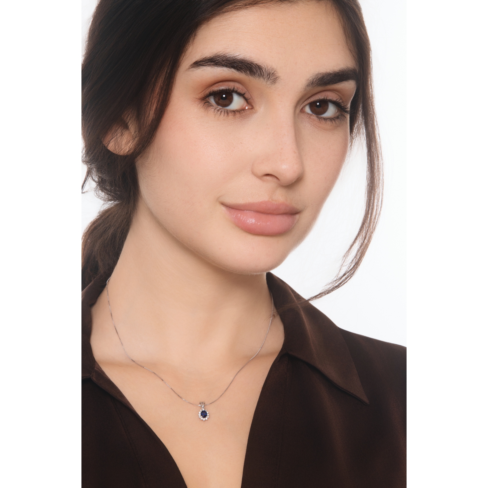 Élégant collier contourné en or blanc 18k avec saphir bleu ovale central de 5x4 mm et diamants taille brillant, couleur H, pureté VS. Un bijou raffiné et lumineux, parfait pour toutes les occasions.