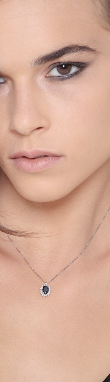 Collier en or blanc 18k avec diamants et saphir bleu ovale au centre