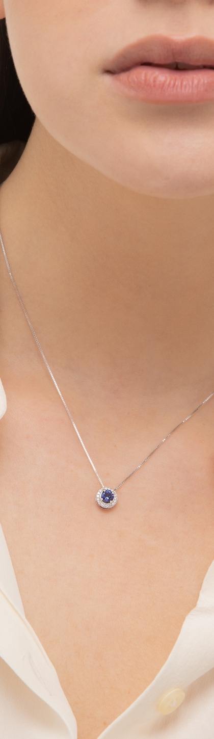 Collier en or blanc 18k avec saphir bleu central et halo en diamants