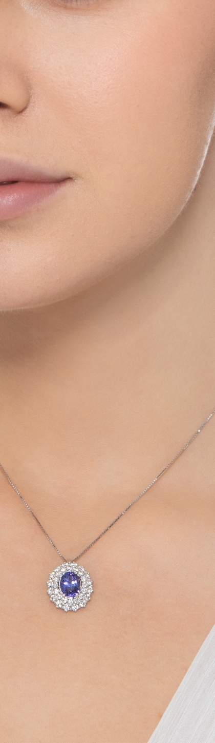 Collier en or blanc 18k avec tanzanite ovale et double halo de diamants