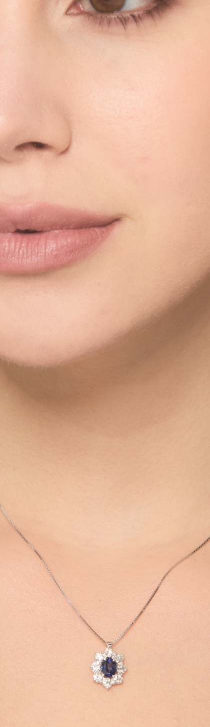 Collier en or blanc 18k avec un saphir bleu halo diamants
