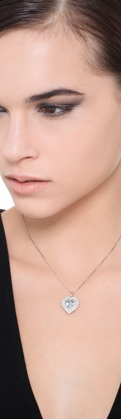 Collier femme pendentif en or blanc 750 à coeur aigue-marine et diamants