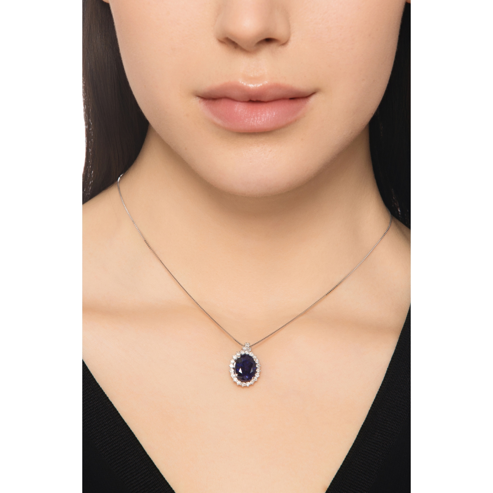 Collier Or Blanc 18k avec saphir bleu 10x8 entouré de diamants