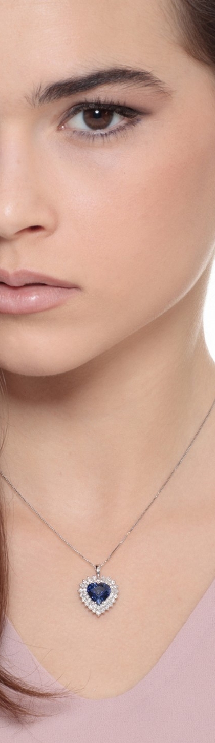Collier saphir bleu cœur halo diamants design en or blanc 18k