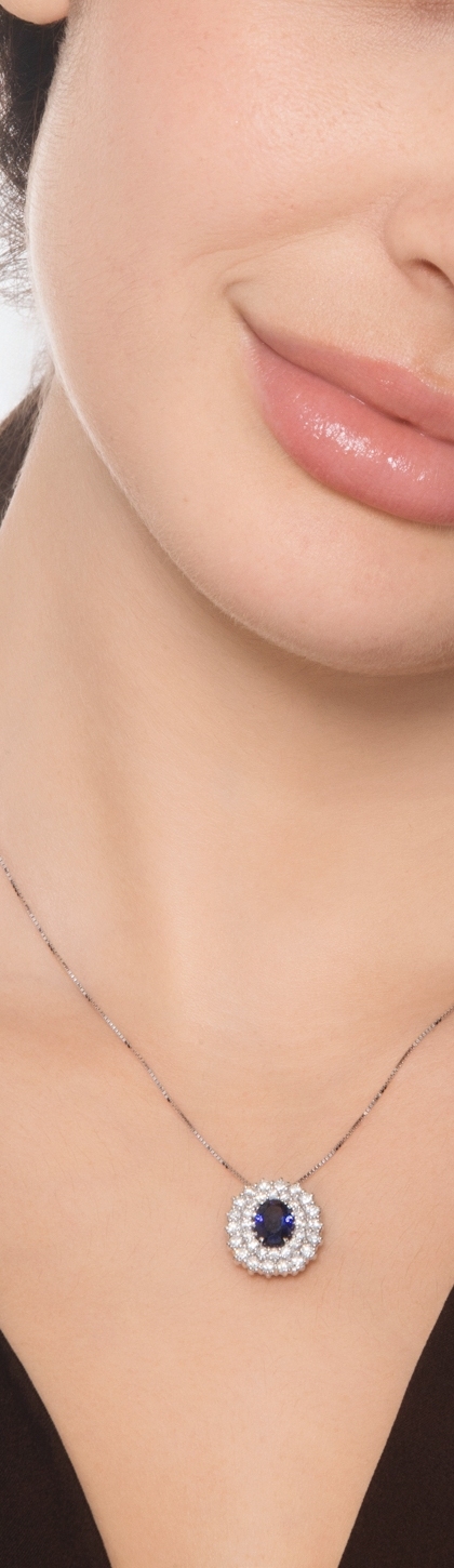 Pendentif à double contour en or blanc 18 carats avec saphir bleu et diamants