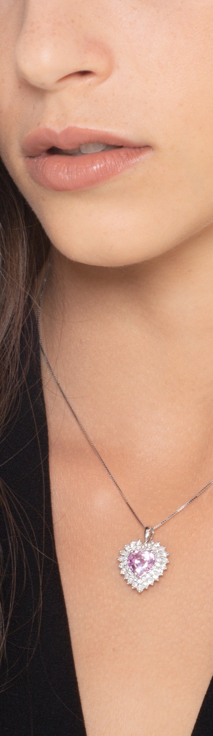 Pendentif en or blanc 18k saphir rose cœur entouré de brillants