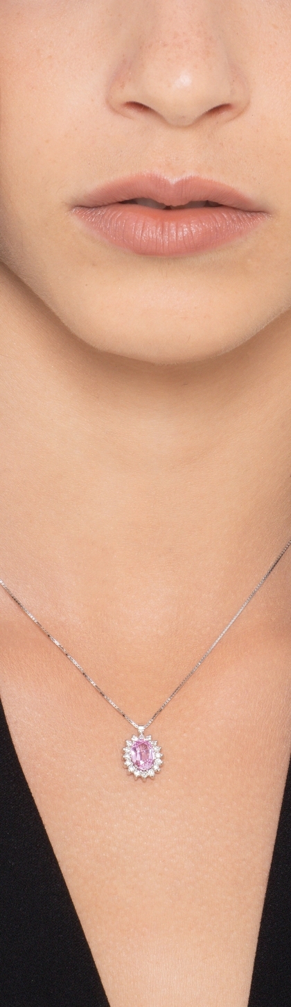 Pendentif halo en or blanc 18 carats avec saphir rose ovale et diamants