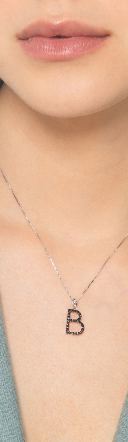 Collier en or blanc 18 carats avec pendentif lettre B gravée et diamants noirs