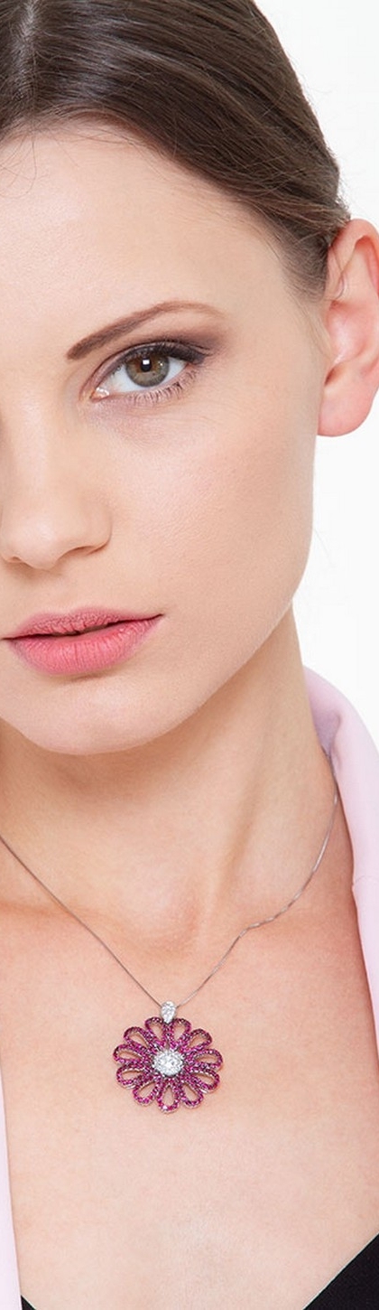 Collier en or blanc 18 carats orne d’une fleur de rubis et diamants