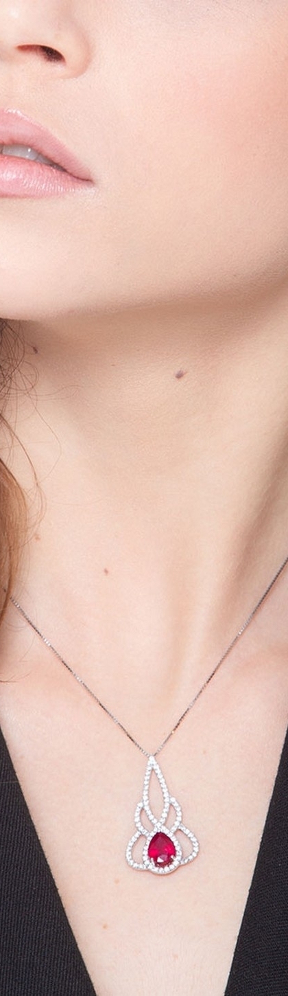 Collier en or blanc 18k avec pendentif flamme rubis et diamants