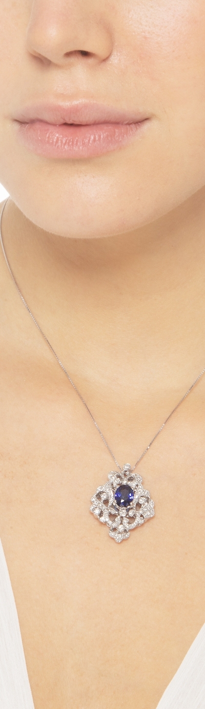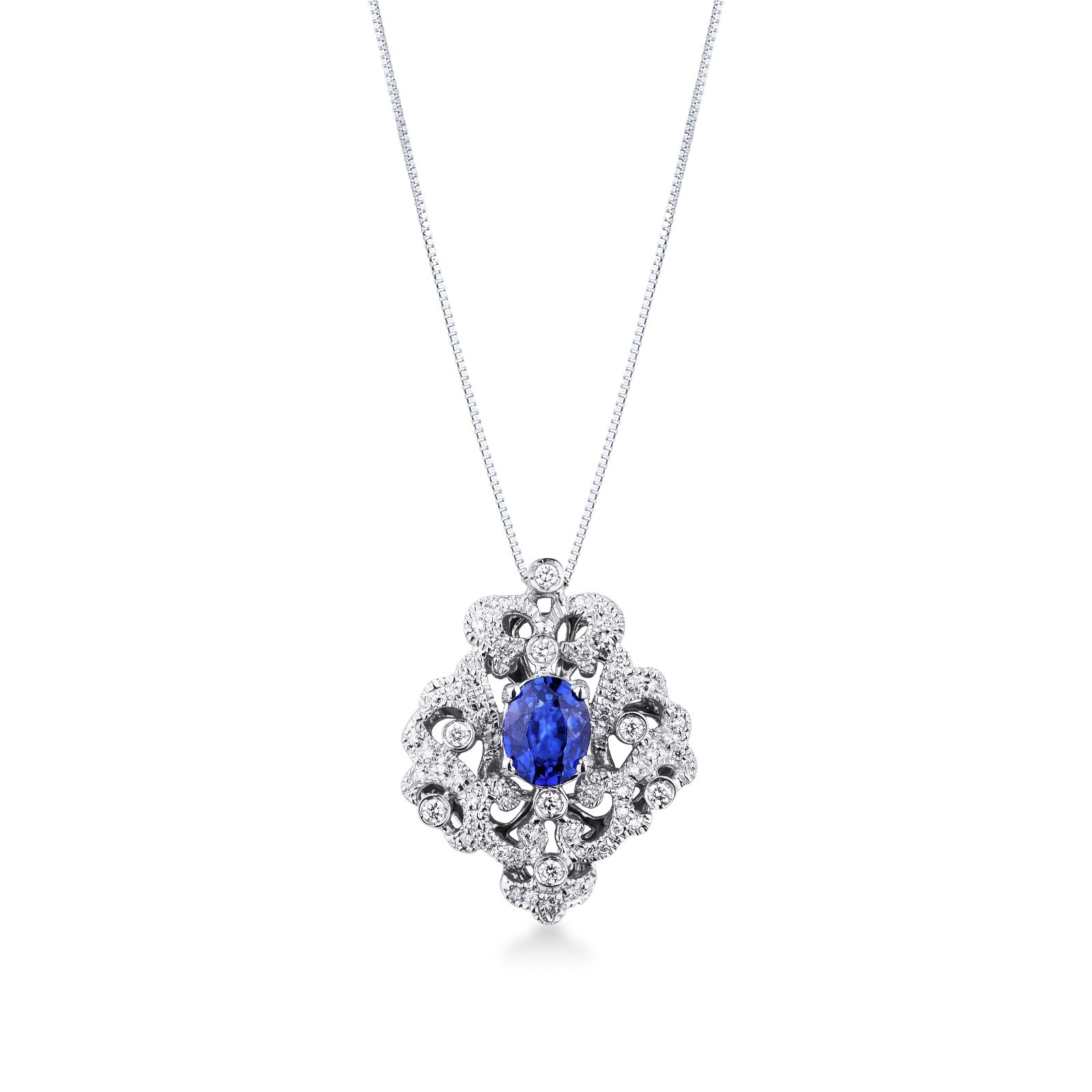 Collier en or blanc 18k avec pendentif rosace saphir bleu et diamants