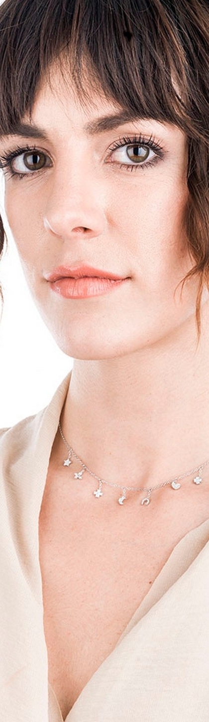 Collier en or blanc 18k avec pendentifs symboliques et diamants