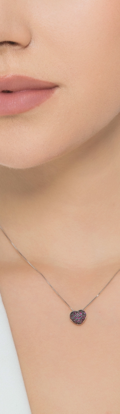 Collier en or blanc 750 avec pendentif cœur pavé bruni serti de rubis.