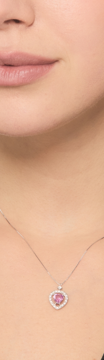 Collier en or blanc 18K avec pendentif cœur serti d’un saphir rose et de diamants taille brillant, couleur H, pureté VS. Le saphir rose mesure environ 6x6 mm.