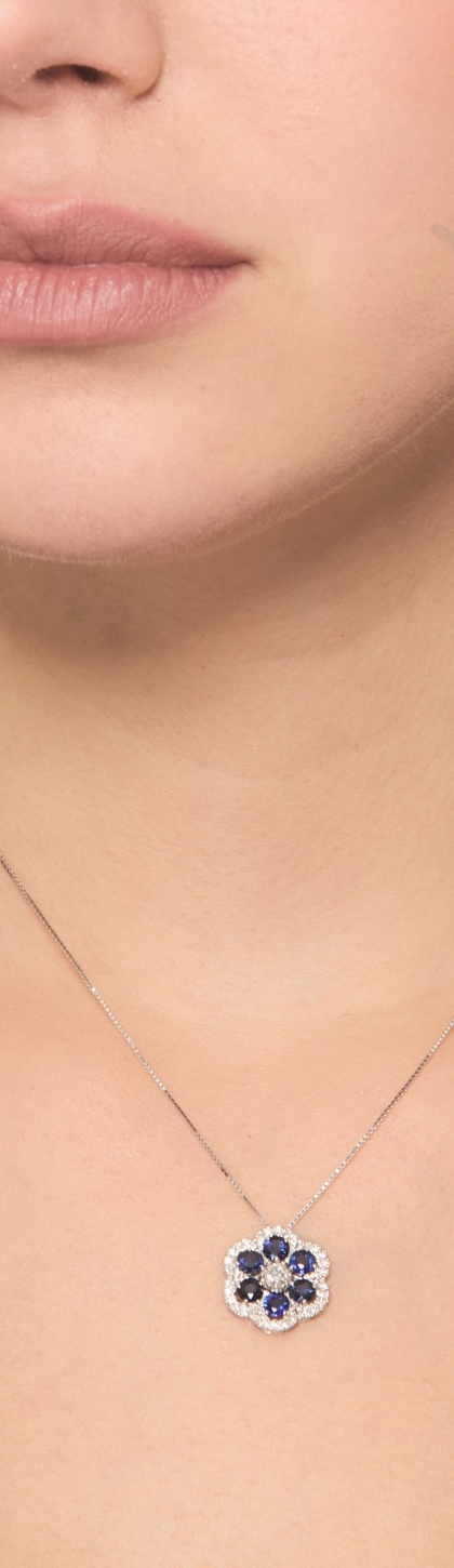 Collier or blanc 18k avec fleur saphirs bleus et diamants