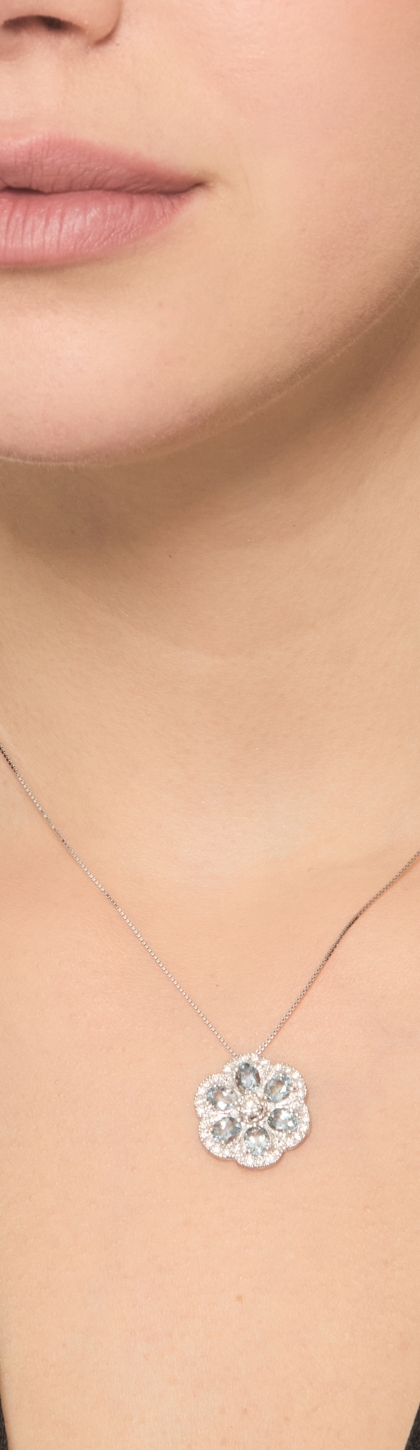 Collier or blanc 18k avec pendentif fleur aquamarines