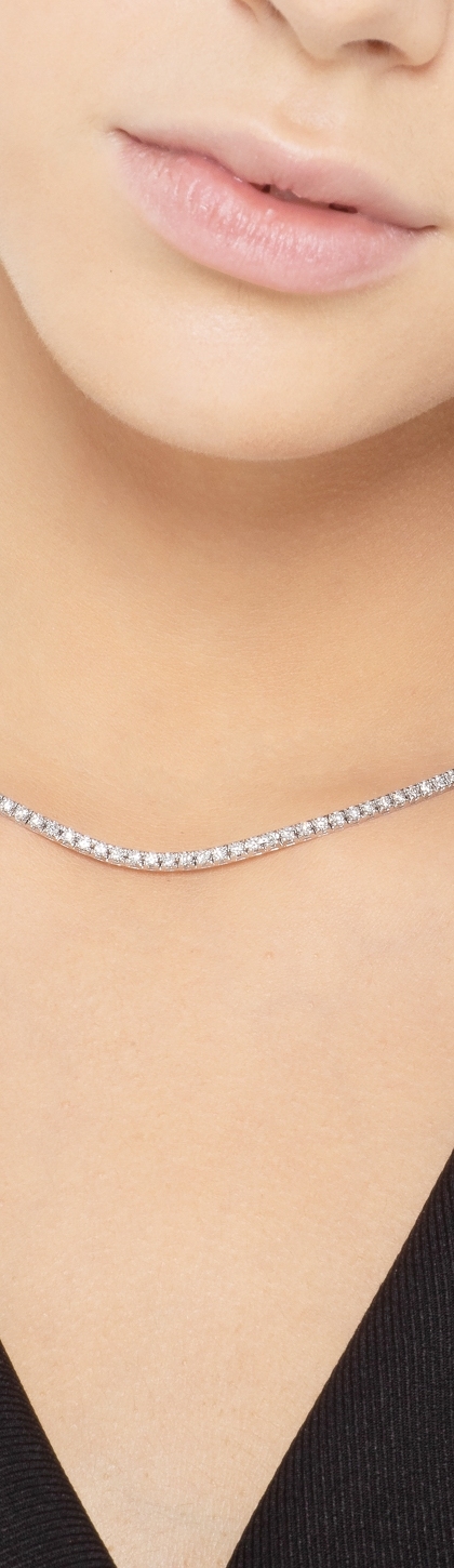 Raffiné collier tennis en or blanc 18k serti de diamants taille brillant couleur H et pureté VS. Largeur des maillons : 2,40 mm. Une ligne élégante et fluide qui épouse parfaitement le cou, symbole de luxe et d’élégance