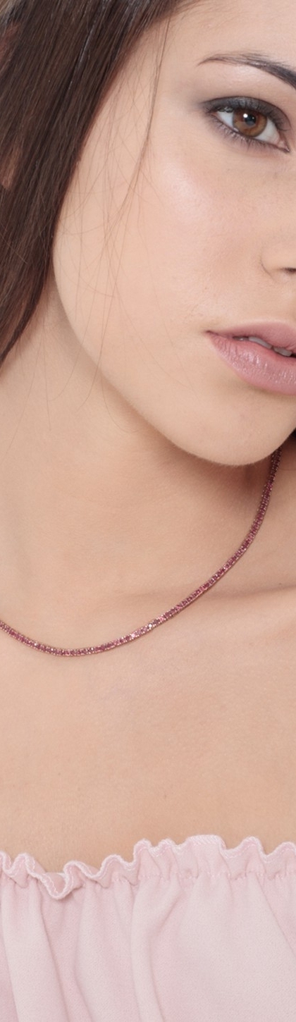 Collier tennis en or rose 18k avec rubis taille brillant sertis. Le caratage peut varier en fonction de la longueur du collier. Largeur du maillon : 2,20 mm. Un bijou aux lignes douces qui épouse parfaitement le cou, d'une finition exquise et d'une élégance intemporelle
