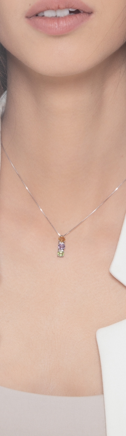 Collier en or blanc 18k avec trilogie de pierres précieuses multicolores